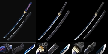 High-carbon steels like 1045, 1060, or 1095 are the traditional benchmarks for hand-forged Japanese-style blades, prized for their hardness-toughness balance when differentially hardened. Manganese steel (commonly Mn65 or similar grades) adds manganese as a primary alloying element, which increases hardenability and surface hardness while giving the blade different aesthetic responses to heat and chemical treatment — most notably the vivid blue and black tones that define this collection. For display collectors who prioritize visual character over differential hardening aesthetics (hamon), manganese steel's richer patination response and consistent finish make it a compelling choice. The tradeoff is that manganese steel typically does not produce the same clay-hardened hamon patterns associated with traditional tamahagane-style work, so collector preferences tend to split along aesthetic lines.