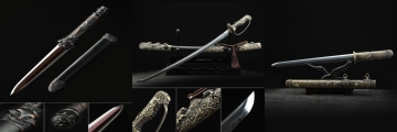 Manganese Steel Ninjato With Black Blade & Dragon Tsuba In Gold-black Flower Saya