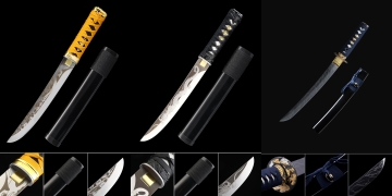 Green tanto swords in this collection cover the main tanto styles with green as the defining color element. Damascus steel green tanto are among the most visually complex pieces: the fold-forged layered blade patterning and the vivid green scabbard create a collectible where both the material character and the color aesthetic reward attention. The Damascus tanto profile follows the standard tanto configuration with a single-edged blade, full fitting set including tsuba guard and ito-wrapped handle, and matching green scabbard. T10 carbon steel green tanto represent the premium quality tier, with clay-tempered pieces capable of displaying a visible hamon - the contrast between a precise T10 hamon on the polished blade and the vivid green scabbard creates a particularly distinctive collector's piece. Melaleuca Steel green tanto round out the collection with high-hardness blade construction in the green color configuration. All styles feature full-tang construction with mekugi retention pins.