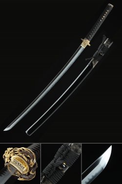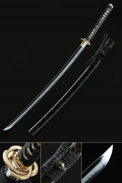 T10 Carbon Steel Katana with White Hardwood Saya - Clay Tempered, Real Hamon, Black-White Ito