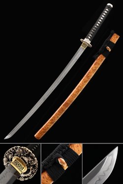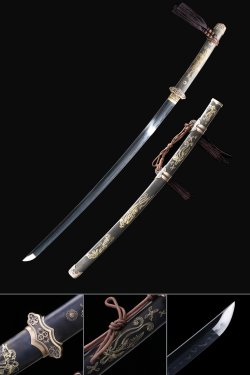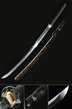 T10 Clay Tempered Katana with Real Hamon - Sunflower Gold Tsuba, Piano Lacquer Black Saya