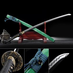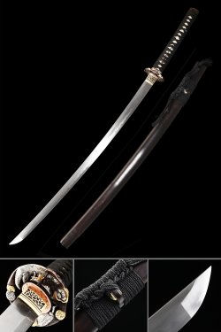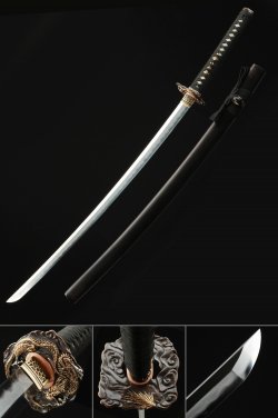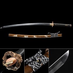 - Gold-toned alloy tsuba adds a refined accent against the dark blade and black scabbard, elevating this katana into the premium display tier