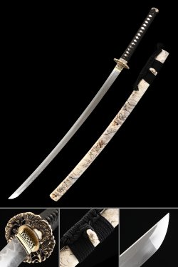 - Black hardwood saya finished in high-gloss piano lacquer for a deep, mirror-like surface, fitted with a genuine horn koiguchi for smooth, snag-free blade seating