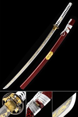 Damascus Steel Katana with Hamon, Gold Samurai Tsuba & Brown Dragon Lacquer Saya