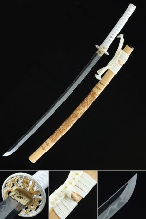 The saya is the defining visual feature of this piece. Crafted from hardwood and finished in piano lacquer, the brown surface is carved with an all-over dragon motif - black figural detail pressed into the warm amber-brown base, visible across the full 29.52-inch length. A black-and-white braided sageo cord is knotted at the kurikata, its two-tone pattern echoing the tsuka-ito and providing a clean visual link between handle and saya. This piece sits naturally within the broader range of Damascus Blade Samurai Swords built around traditional koshirae fittings.