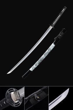 - Brown hardwood saya finished in piano lacquer with carved dragon motif across the surface - a striking visual centerpiece when displayed.