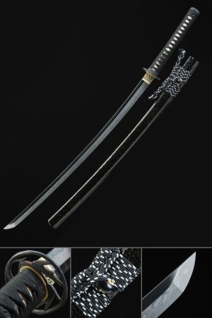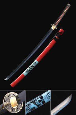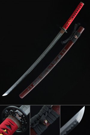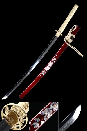 T10 Clay Tempered Katana with Real Hamon in Black Hardwood Saya - Tiger Tsuba, Black & Red Sageo