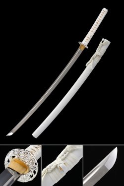 At 40.94 inches overall and 4.4 lbs, this katana carries visual weight with its silver-and-white color scheme and gold tsuba accents. The spring steel blade, sharpened edge, and full tang build deliver substance behind the presentation, making it a serious addition to any Japanese sword collection.