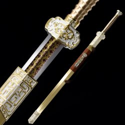 This battle-ready red han dynasty swords is made of spring steel, designed to be perfect for practical Chinese martial arts training. The blade is specially treated to achieve optimal levels of durability and hardness. Traditional design with modern construction, this is not your average wushu sword. It is a weighty sword with a hand-sharpened edge for practical use, or for serious collectors and Chinese history enthusiasts. It comes with an exquisite hardwood scabbard and high-quality fittings. The sword is great for tai chi, kung fu, wushu, cutting practice, and display. It's durable enough for trees and bamboo. Each sword is individually handmade so specifications vary slightly from sword to sword. notes: not include stand. ...