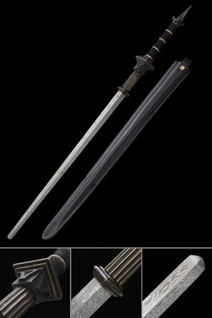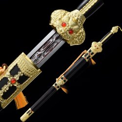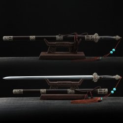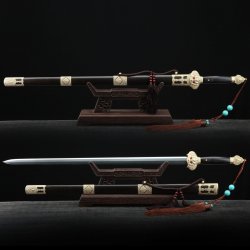 This battle-ready black han dynasty swords is made of spring steel, designed to be perfect for practical Chinese martial arts training. The blade is specially treated to achieve optimal levels of durability and hardness. Traditional design with modern construction, this is not your average wushu sword. It is a weighty sword with a hand-sharpened edge for practical use, or for serious collectors and Chinese history enthusiasts. It comes with an exquisite hardwood scabbard and high-quality fittings. The sword is great for tai chi, kung fu, wushu, cutting practice, and display. It's durable enough for trees and bamboo. Each sword is individually handmade so specifications vary slightly from sword to sword. notes: not include stand.