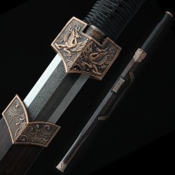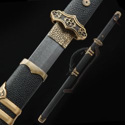 This battle-ready black han dynasty swords is made of pattern steel, designed to be perfect for practical Chinese martial arts training. The blade is specially treated to achieve optimal levels of durability and hardness. Traditional design with modern construction, this is not your average wushu sword. It is a weighty sword with a hand-sharpened edge for practical use, or for serious collectors and Chinese history enthusiasts. It comes with an exquisite hardwood scabbard and high-quality fittings. The sword is great for tai chi, kung fu, wushu, cutting practice, and display. It's durable enough for trees and bamboo. Each sword is individually handmade so specifications vary slightly from sword to sword. notes: not include stand. ...