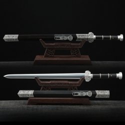 This battle-ready black han dynasty swords is made of manganese steel, designed to be perfect for practical Chinese martial arts training. The blade is specially treated to achieve optimal levels of durability and hardness. Traditional design with modern construction, this is not your average wushu sword. It is a weighty sword with a hand-sharpened edge for practical use, or for serious collectors and Chinese history enthusiasts. It comes with an exquisite hardwood scabbard and high-quality fittings. The sword is great for tai chi, kung fu, wushu, cutting practice, and display. It's durable enough for trees and bamboo. Each sword is individually handmade so specifications vary slightly from sword to sword. notes: not include stand. ...