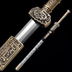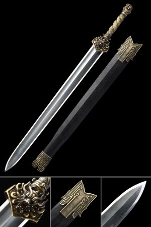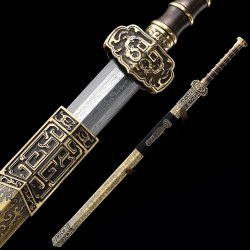 This battle-ready natural han dynasty swords is made of pattern steel, designed to be perfect for practical Chinese martial arts training. The blade is specially treated to achieve optimal levels of durability and hardness. Traditional design with modern construction, this is not your average wushu sword. It is a weighty sword with a hand-sharpened edge for practical use, or for serious collectors and Chinese history enthusiasts. It comes with an exquisite hardwood scabbard and high-quality fittings. The sword is great for tai chi, kung fu, wushu, cutting practice, and display. It's durable enough for trees and bamboo. Each sword is individually handmade so specifications vary slightly from sword to sword. notes: not include stand. ...