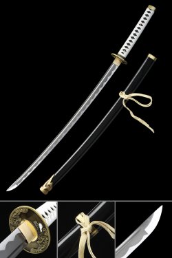 - Yellow hardwood saya finished in matte lacquer runs 30.3 inches and is secured with a braided yellow sageo cord tied in a decorative knot at the koiguchi.