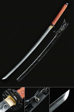 - 1045 carbon steel blade stretching 27.5 inches, clay-tempered with a hand-finished hamon line and floral engravings etched along the darkened surface for visual depth.