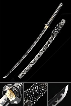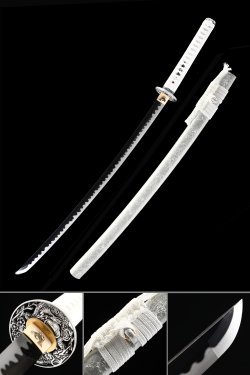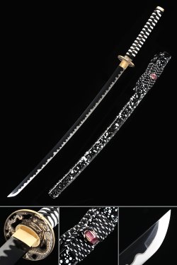 - High manganese steel blade, black scabbard, round theme tsuba, black cord handle with white ray-skin wrap.