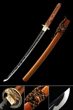- High manganese steel blade, orange scabbard, dragon theme tsuba, gold cord handle with white ray-skin wrap.