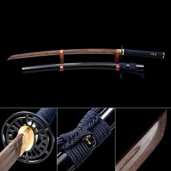 - Brown wooden blade, blue scabbard, kirsite tsuba, brown cord handle with black ray-skin wrap.