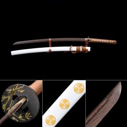 - Brown wooden blade, orange scabbard, bronze tsuba, beige cord handle with black ray-skin wrap.