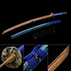 - Brown wooden blade, orange scabbard, kirsite tsuba, dark blue cord handle with white ray-skin wrap.