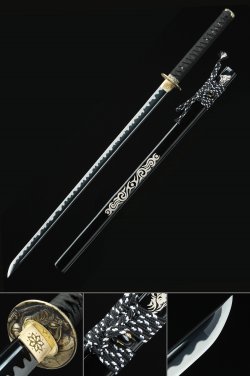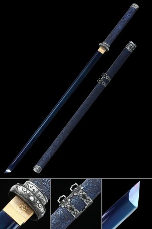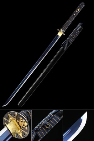 Chokuto Ninjato in 1095 Carbon Steel with Blue Blade & Black Textured Saya - Full Tang