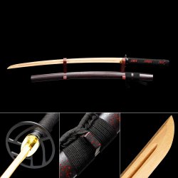 - Wooden blade, natural scabbard, iron tsuba, black cord handle with red ray-skin wrap.