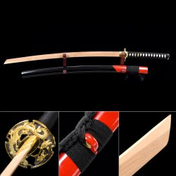 - Natural bamboo wooden blade, gray scabbard, alloy tsuba, beige cord handle with black ray-skin wrap.
