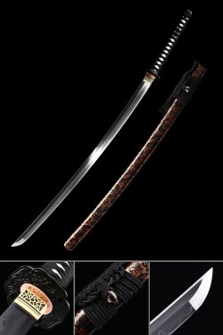 - Heat treated and oil quenched at 41 inches overall and 3.0 pounds, hand polished to highlight the natural hamon wave pattern across the blade
