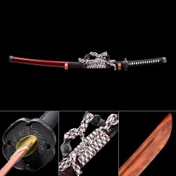- Natural wooden blade, black and red scabbard, alloy tsuba, brown cord handle with white ray-skin wrap.