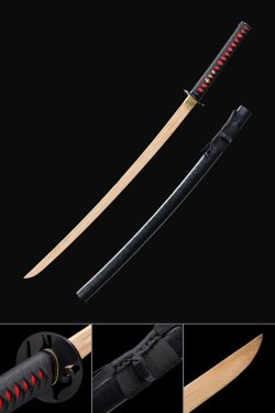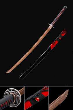 - Natural wooden blade, black scabbard, iron tsuba, red cord handle with black ray-skin wrap.