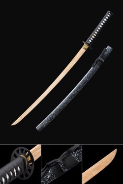 - Natural wooden blade, white scabbard, copper tsuba, black cord handle with white ray-skin wrap.