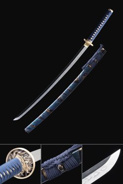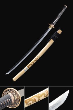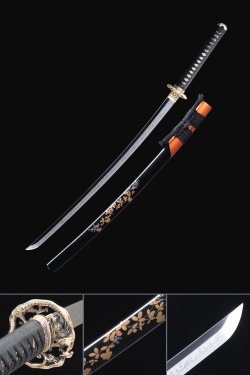 T10 Steel Katana with Natural Wood Saya, Gold Flower Tsuba & Wave-Engraved Blade - Full Tang