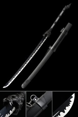 The blade is forged from manganese steel and finished in a deep black coating, with a polished edge and a wave engraving along the spine that catches light at every angle. A visible hamon line traces the edge from habaki to tip, giving the blade the layered visual depth characteristic of traditional Japanese sword craft. The full-tang construction runs the length of the handle, ensuring solid balance across the sword's 41-inch overall length.