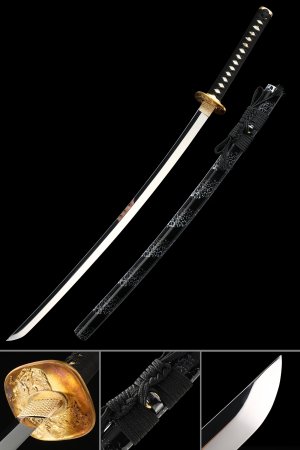 Manganese Steel Katana with Black Blade, Orange Lacquer Saya and Gold Dragon Tsuba