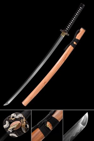 - Blade forged from T10 carbon steel with a visible hamon line and hand-finished edge, running full tang through the handle for structural integrity across the entire 40.5-inch length.