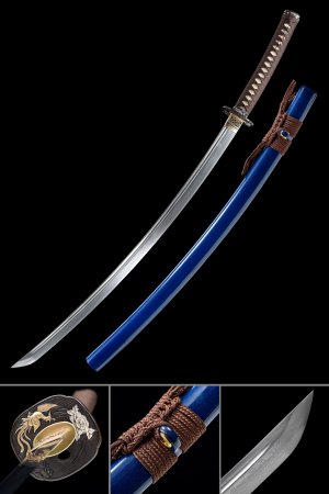 This katana suits a collector drawn to bold color work and ornate metalwork equally - the blue blade and engraved gold fittings read as a coherent aesthetic choice rather than independent add-ons. Displayed on a stand or resting in its saya, the piece carries the visual weight of a serious addition to any Japanese sword collection.