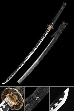 1095 Carbon Steel Katana with Real Hamon in Red Lacquered Hardwood Saya - Black & Red Koshirae