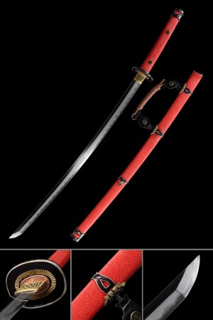 The handle is wrapped with real green rayskin, a traditional material used in the making of Japanese swords, as it provides a firm grip and helps absorb sweat, preventing the sword from slipping out of the hand during use. The green color of the rayskin adds an element of uniqueness and beauty to the sword, making it a visually stunning piece.