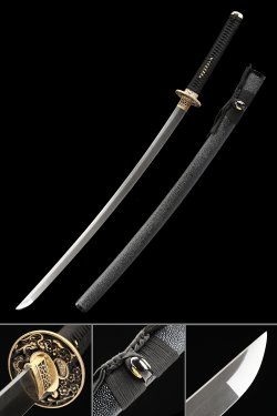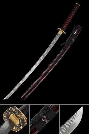 Folded Damascus Steel Japanese Katana with Python Copper Tsuba - Black Lacquer Saya, Full Tang