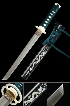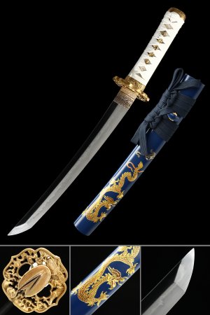 Manganese Steel Tanto with Blue Dragon-Painted Hardwood Saya - White Ito & Gold Tsuba
